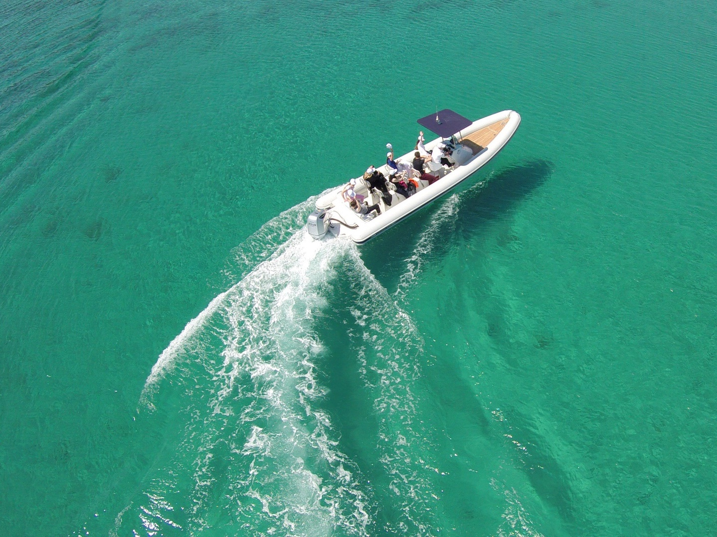 Lolivul 9 boat rental is praised as one of the most reliable and safest RIB boats, suitable for all weather conditions. This custom-made boat is 8.60m (28ft) long, with an overall length of 11.20m (37ft) which makes it spacious enough to comfortably host 12 people on 8-10 jockey seats and a crew of 2 experienced locals which will ensure you get the best out of this speedboat.